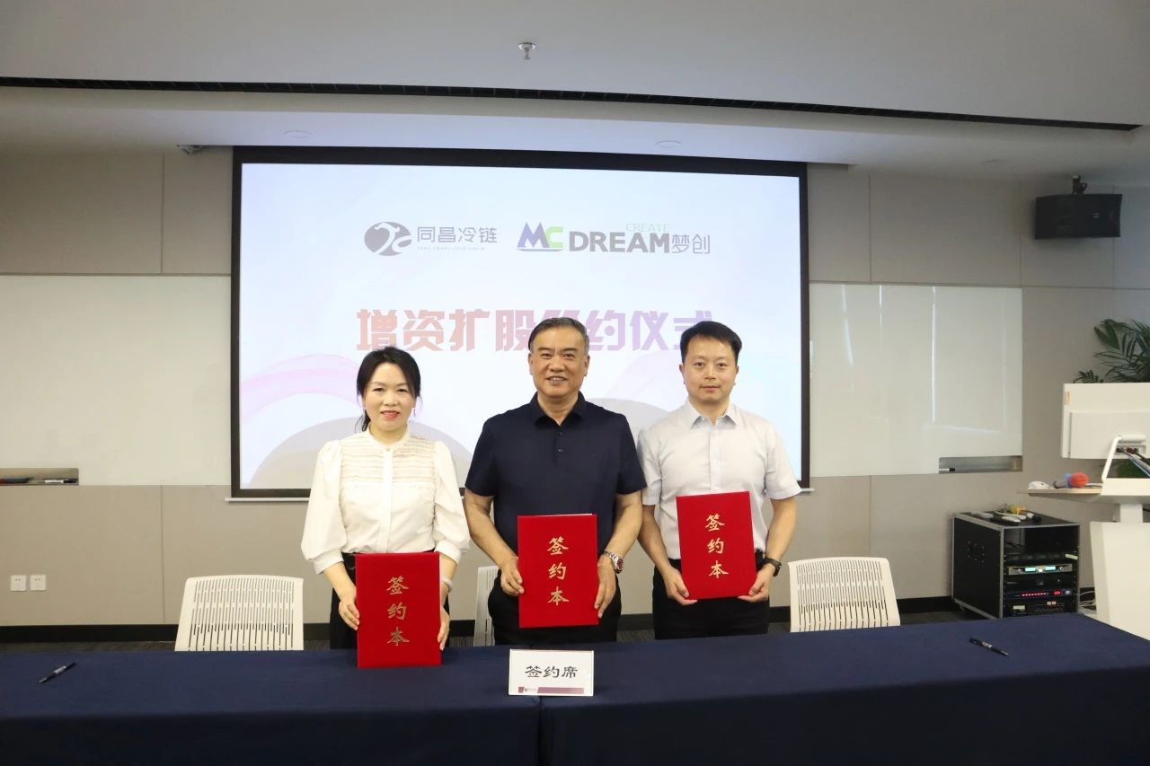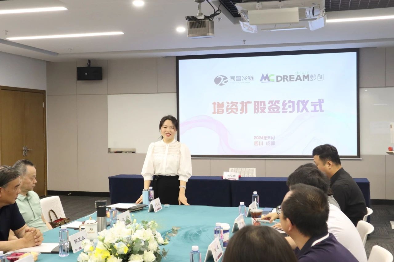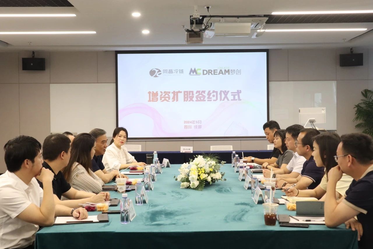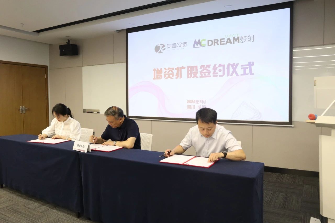 2024年5月14日上午同昌冷链与四川梦创商贸有限公司在同昌集团会议室举行了隆重的增资扩股签署仪式。同昌集团董事长陈正永、集团副总范华、陈昭阳、同昌冷链总经理崔光兰,梦创商贸总经理张健、副总张添鑫及双方核心团队成员出席了本次签约仪式。此次合作的最终达成是双方业务发展的必然选择,是梦创商贸做大做强与市场开拓的有益助力,更是同昌集团打造平台化建设的重要举措。双方力争通过深度合作,能够在多层次、多领域实现资源共享、互利共赢的良好局面。