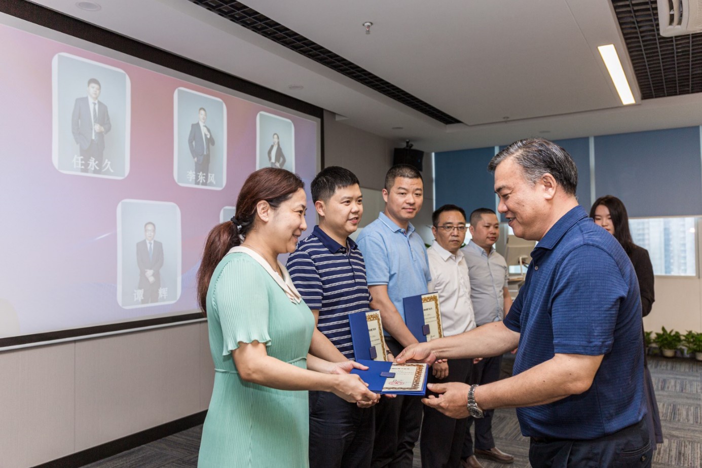 随后,行权证书颁授仪式正式开始,伴随着激昂的音乐和现场热烈的掌声,陈董依次向获得股权激励并如期行权的集团高管和核心技术骨干颁发了行权证书。