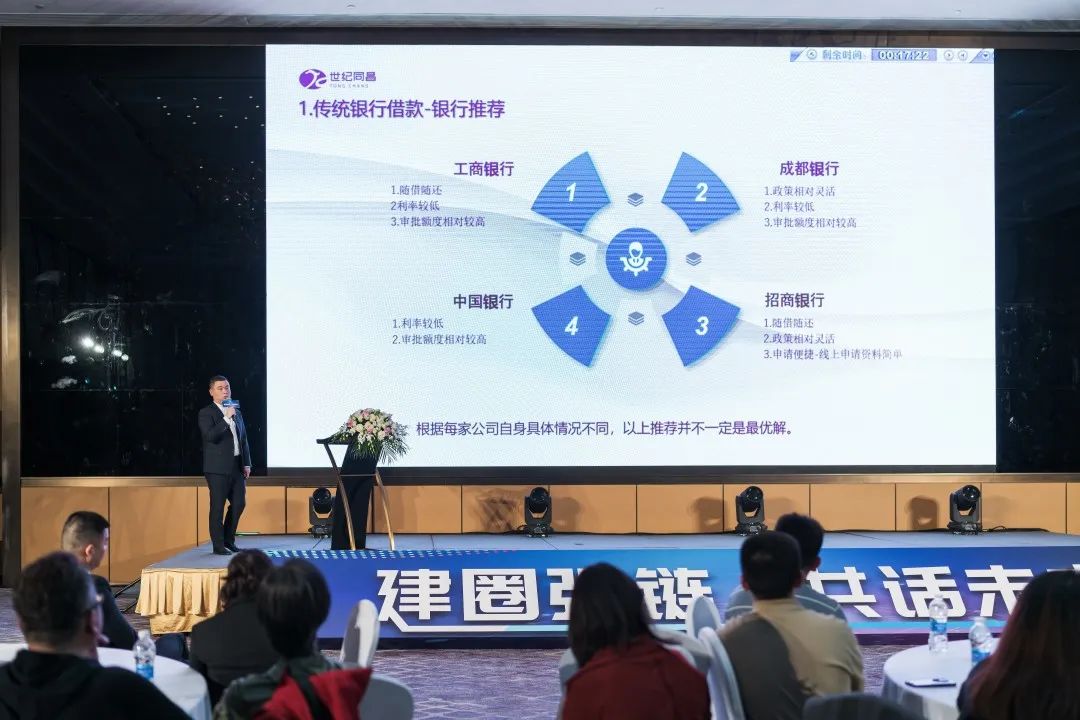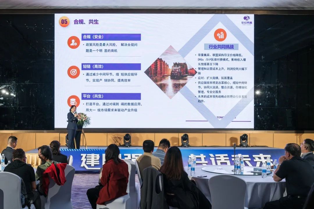 随后,同昌集团旗下四川同昌冷链医药物流有限责任公司总经理崔光兰女士、四川世纪同昌科技发展有限公司总经理闵子强先生、成都同昌医学检验所有限公司总经理谭辉先生先后登台,结合各自主营业务及服务优势向现场嘉宾形象展示了世纪同昌的综合服务能力,集团财务中心经理罗文博从企业融资角度就获取银行低息贷款、应收账款盘活、降低坏账风险等方面与现场嘉宾进行了深入的交流。